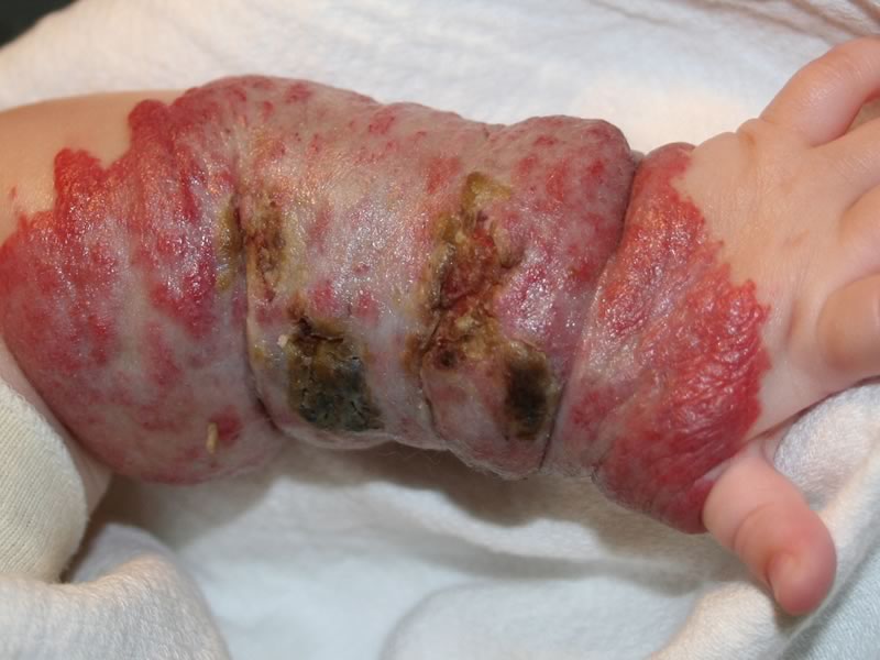 При неудачном расположении, а также просто сильном разрастании опухоли, гемангиомы могут нарушать нормальное функционирование того или иного органа. Особенно это заметно при гемангиоме новорожденных – сосудистое разрастание может препятствовать нормальному дыханию, развитию органов чувств, например, при локализации в районе века. Внимания заслуживают гемангиомы крупных вен и артерий – они встречаются достаточно редко, но при разрастании могут перекрыть просвет сосуда, остановив ток крови, что является потенциально опасным для жизни состоянием. Не менее опасной может быть потеря эластичности стенки сосуда. - Инфицирование.